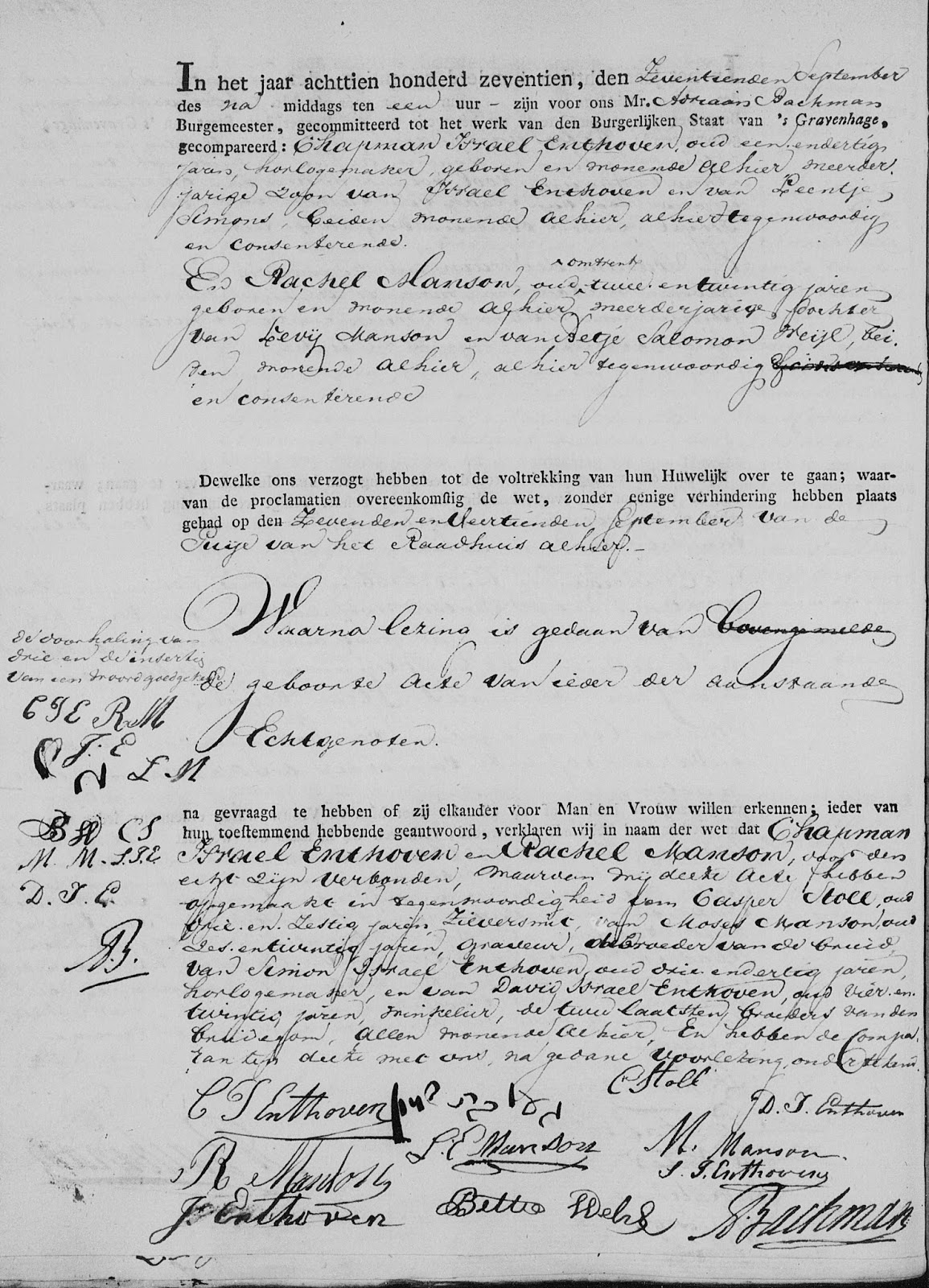 De gegevens in de voornoemde drie berichten spreken elkaar tegen. Uitsluitsel levert de huwelijksakte. Op 17 september 1817 zijn in Den Haag getrouwd: Chapman Israel Enthoven en Rachel Manson: