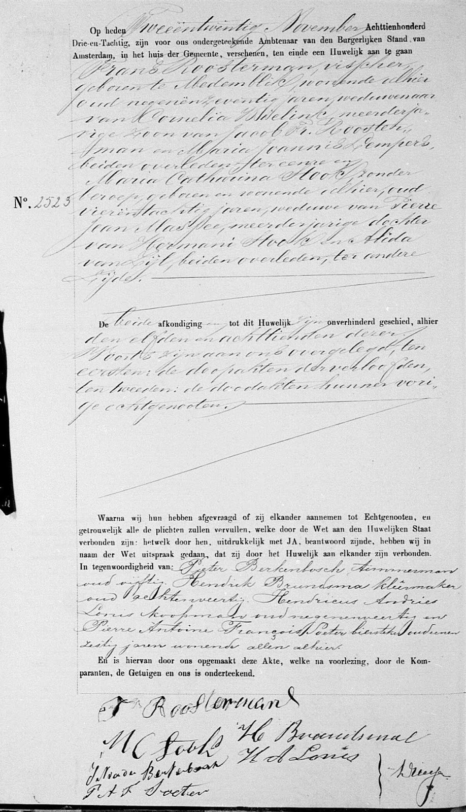Op 22 november 1883 trouwden te Amsterdam de 79-jarige Frans Roosterman en de 84-jarige Maria Catharina Stook:
