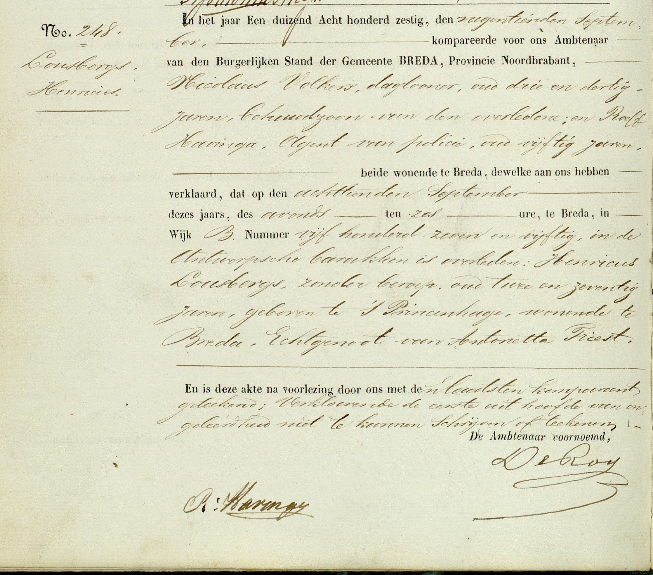Henricus Lousbergs overlijdt op 18 september 1860 te Breda: